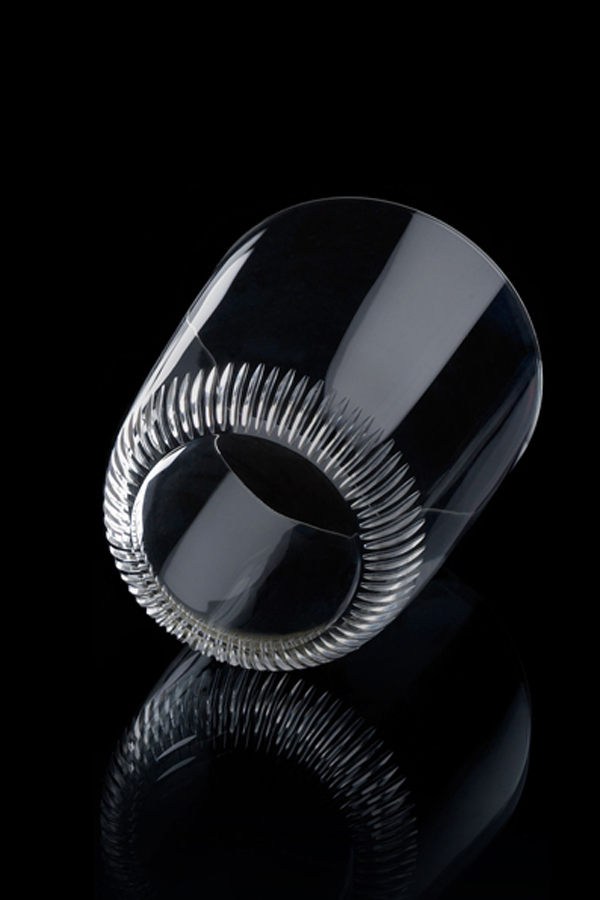 Developed together with the Lobmeyr craftspeople, a rather technical looking design comes to life. A special lamella cut has been developed by emphasizing on the importance that is ascribed to a haptic pleasure when drinking from a glass - literally the "grip". Similar to the well-known "American Bar" set Adolf Loos designed for Lobmeyr in 1929, the ornament prevents scratch marks on the bottom during use. Complementing its "Grip" the drinking set wants to keep the balance between the delicacy of mouthblown glass and glassware that invites for everyday use.